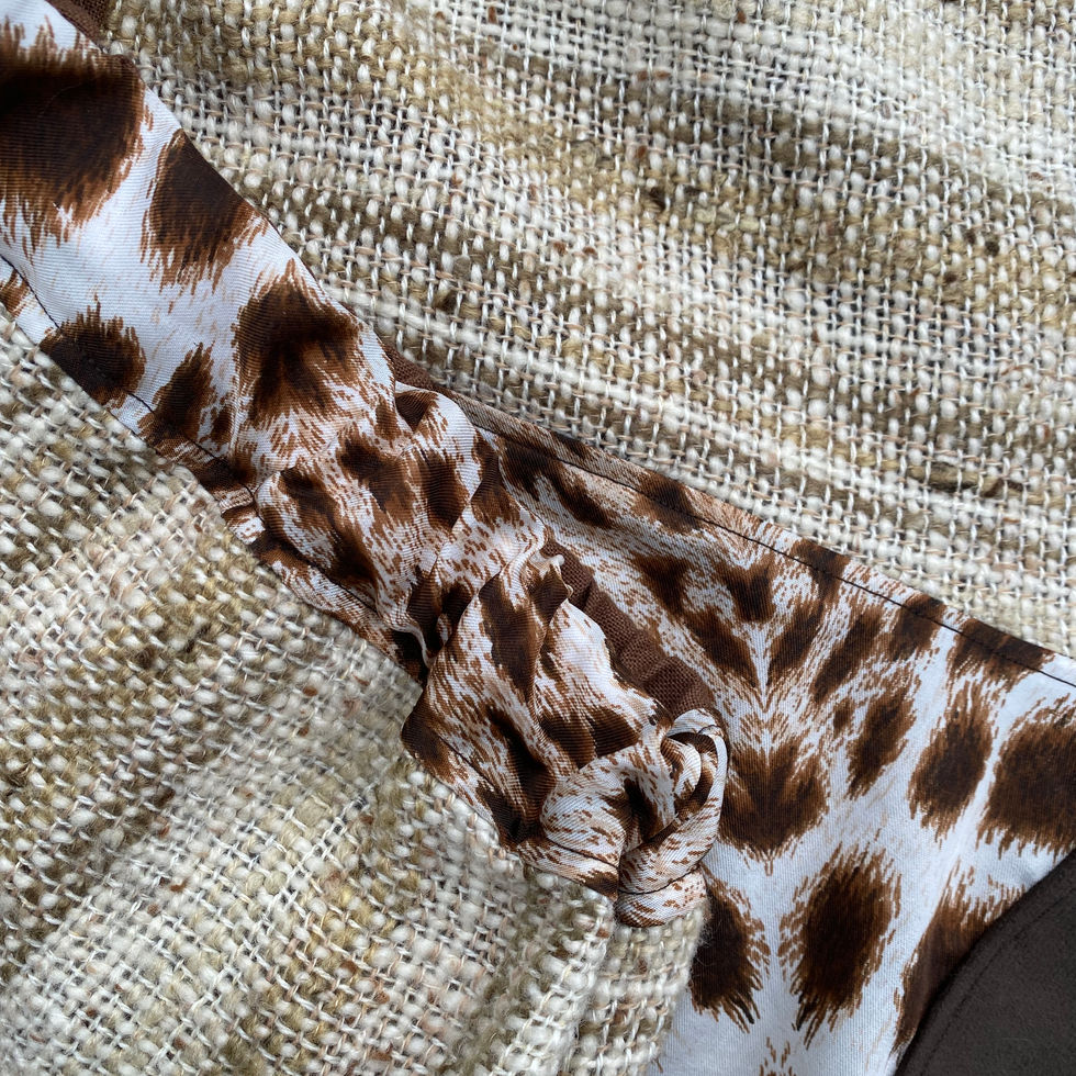 Diese Patchwork-Pyjamahose wurde in Handarbeit aus Reststoffen gefertigt. Die kontrastreiche Beige-Braun,print Optik entsteht aus vielen einzelnen Stofffragmenten, die zusammen eine besondere, fast grafische Wirkung entfalten – jedes Detail mit eigener Geschichte.