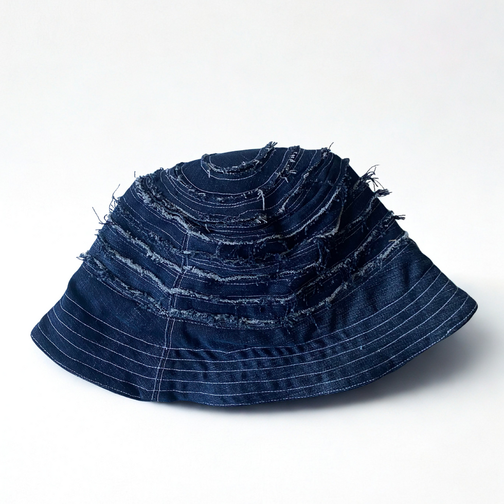 Dieser einzigartige Bucket Hat aus tiefblauem Denim ist das Ergebnis vieler Stunden sorgfältiger Handarbeit – ein echtes Herzensprojekt.