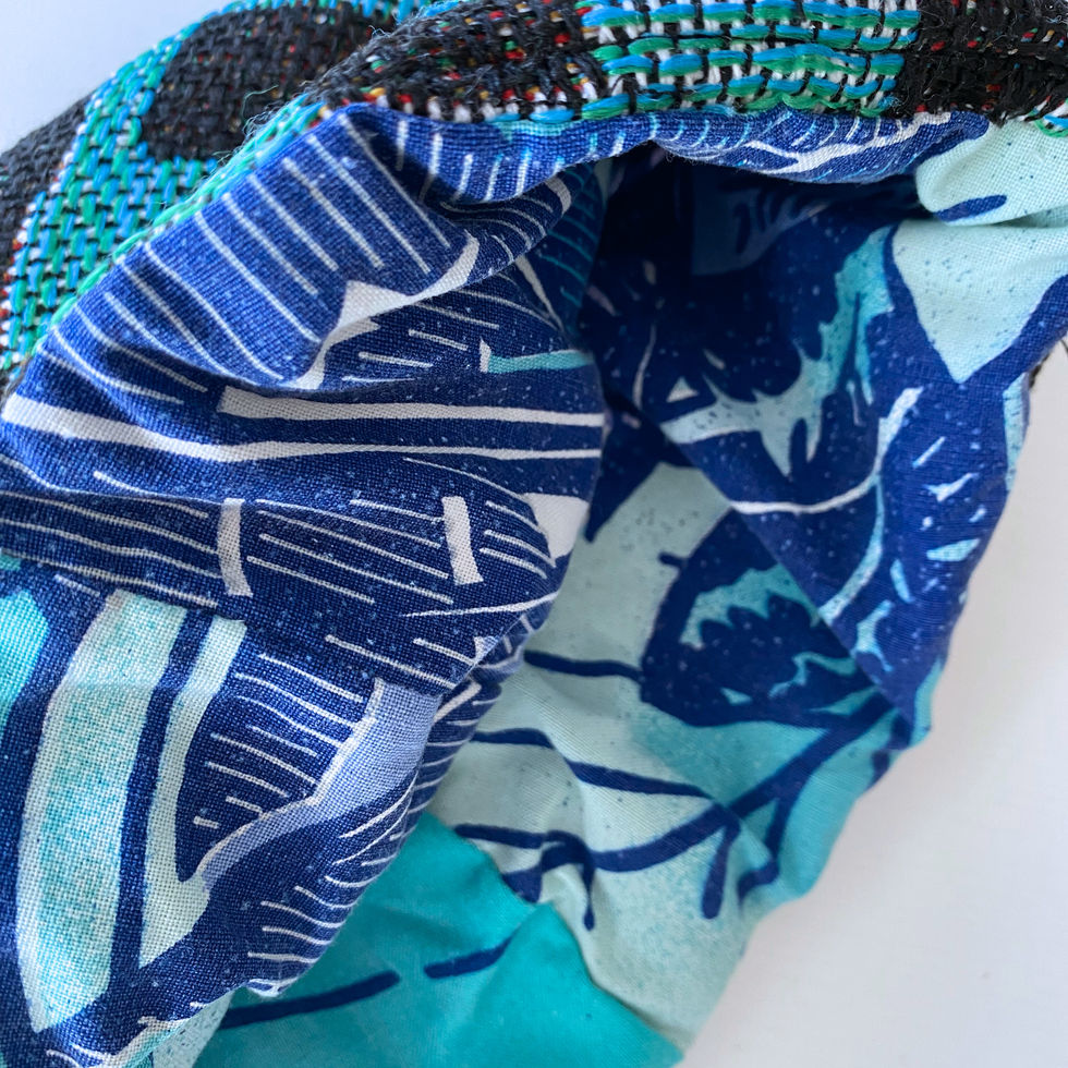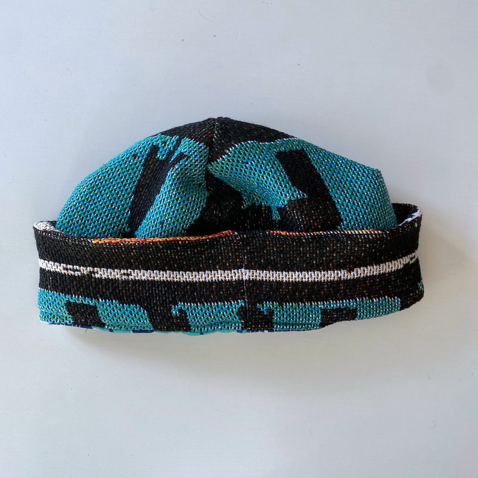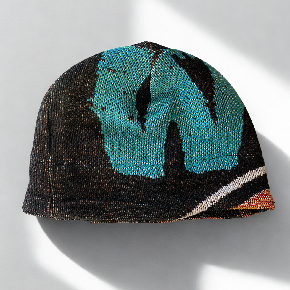 Dieser besondere Beanie ist ein echtes Statement für nachhaltige Mode. Aus sorgfältig ausgewählten Stoffresten gefertigt, entsteht ein Unikat mit Charakter: Der Oberstoff zeigt eine markante, gewebte Struktur in dunklen Tönen, kombiniert mit einem auffälligen türkisfarbenen grafischen Element, das dem Beanie eine moderne, künstlerische Note verleiht. Dezente Farbsprenkel und ein kleiner mehrfarbiger Akzent am Saum unterstreichen den lebendigen Upcycling-Look.