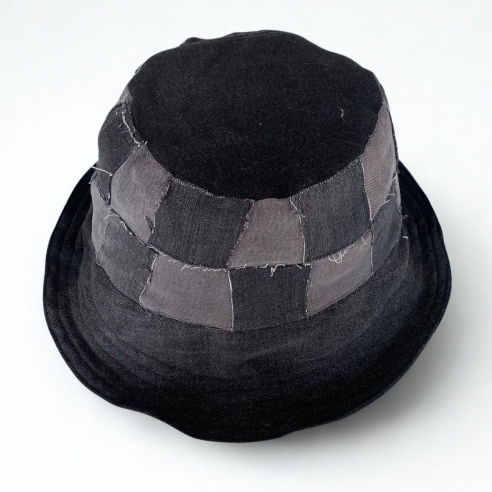 Die Kombination aus schwarzen und dunkelgrauen Denim-Stoffen ergibt ein verspieltes Schachmuster, das durch leicht ausgefranste Kanten seinen authentischen, handgemachten Charakter erhält.